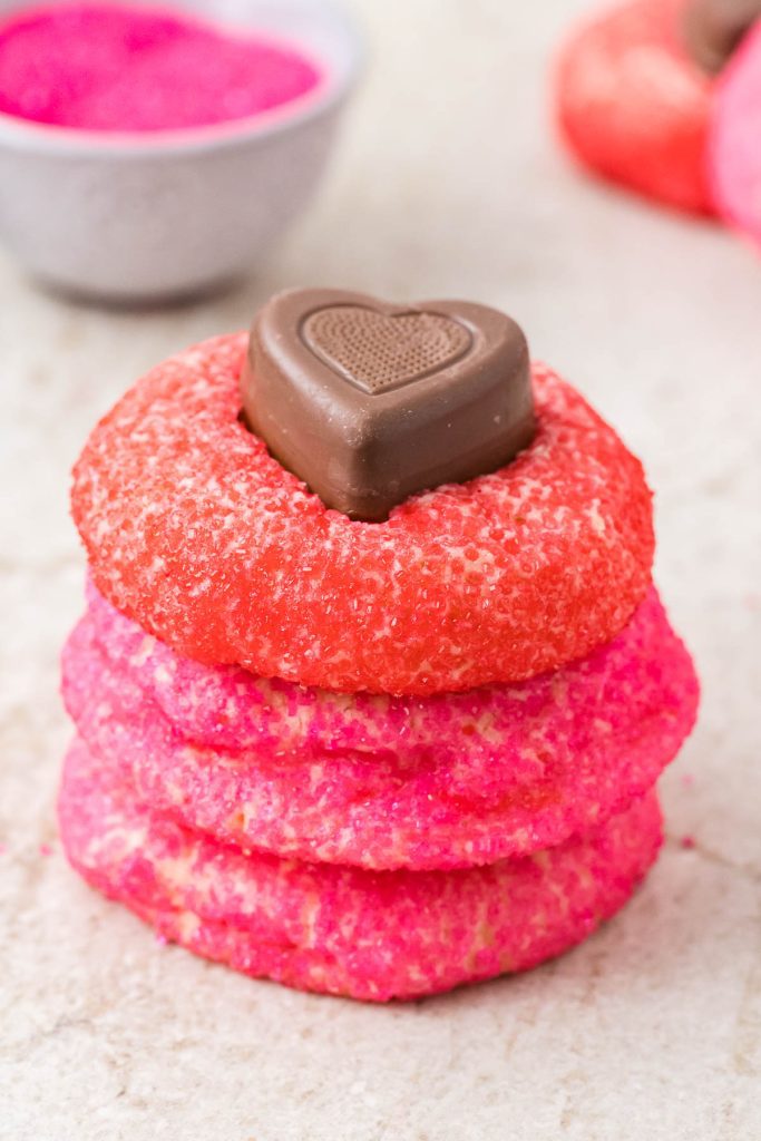 - Roll each dough ball in pink or red sanding sugar to coat.