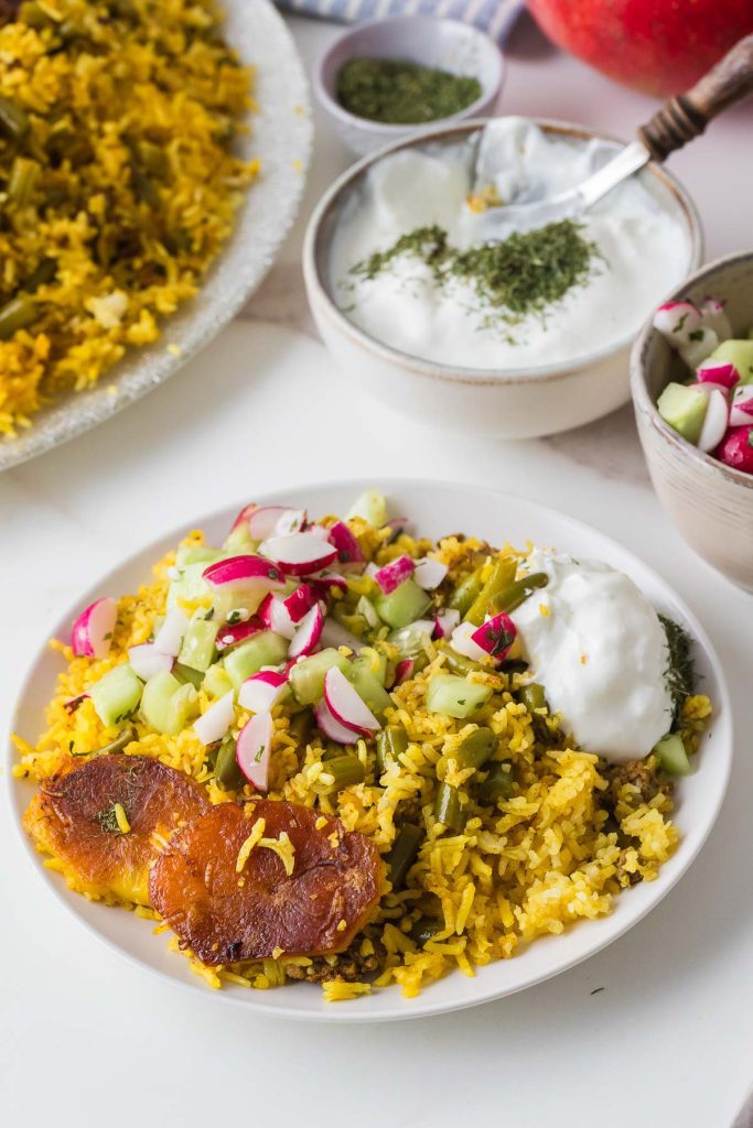 - Gently fluff to mix slightly while keeping layers visible. Serve warm with Shirazi salad and yogurt with dried mint or dill.